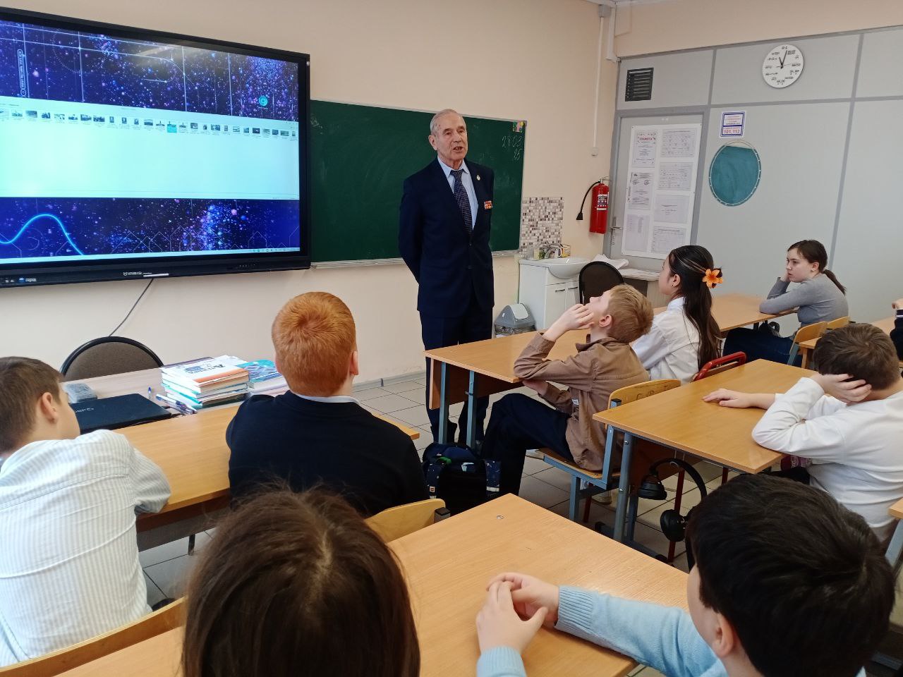 Перед ребятами выступил Юрий Степанович Студеникин — лётчик, заместитель председателя Совета ветеранов района Строгино. Он рассказал о роли военной авиации в тех событиях, а также об истории создания Ржевского мемориала Советскому Солдату — одного из главных символов памяти и мужества в современной России.