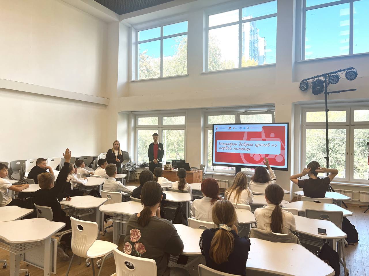 Наша школа присоединилась к марафону: у ребят прошел «Добрый урок», где они познакомились с навыками оказания первой помощи и попробовали накладывать жгуты. Занятие провел Владислав — волонтер-медик и участник Специальной военной операции.